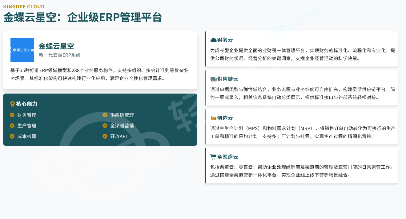 | 财务凭证接口 | 凭证生成、科目余额查询、成本核算数据获取 |