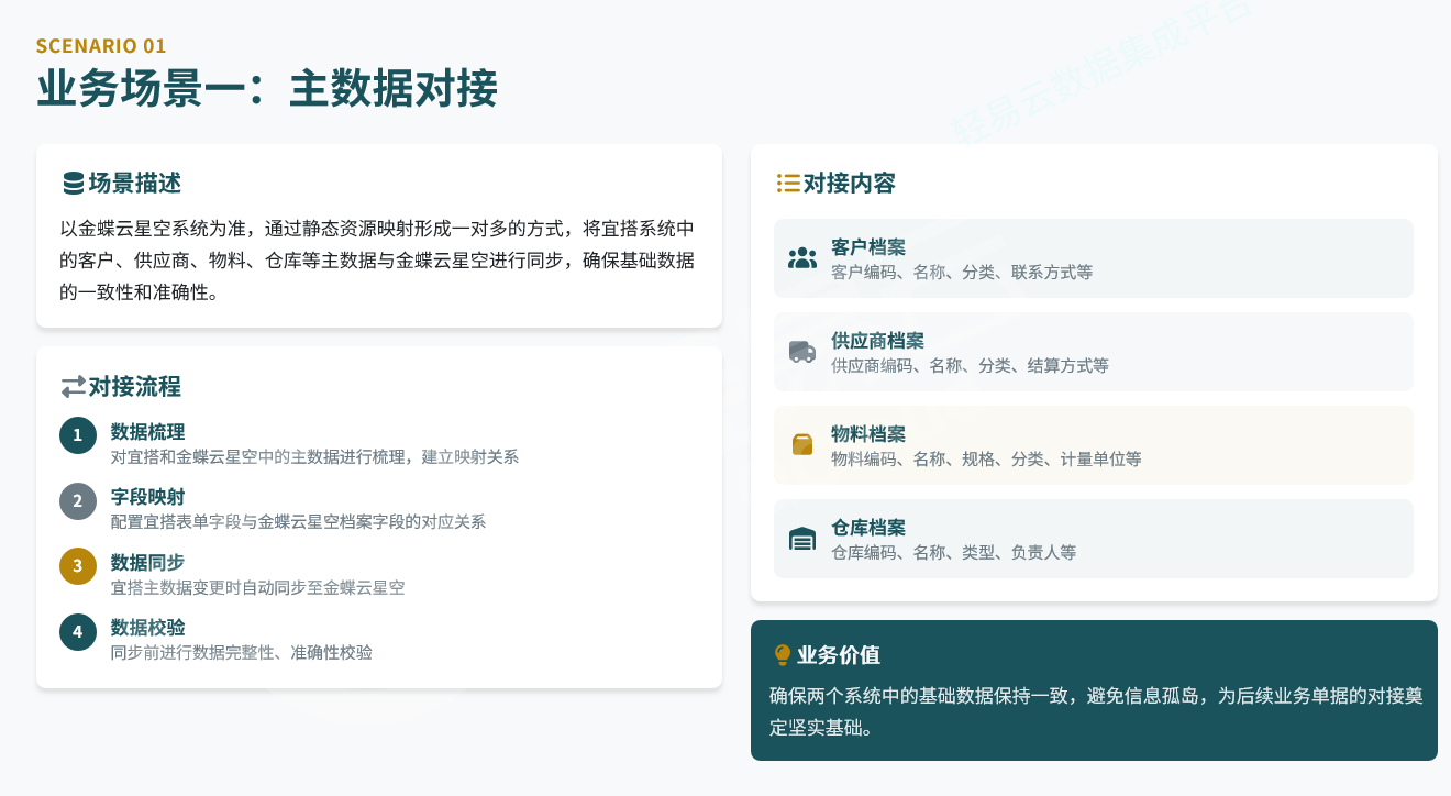 同步策略:以金蝶云星空为权威数据源(Master),宜搭为消费端(Slave),采用"一对多"静态资源映射模式。