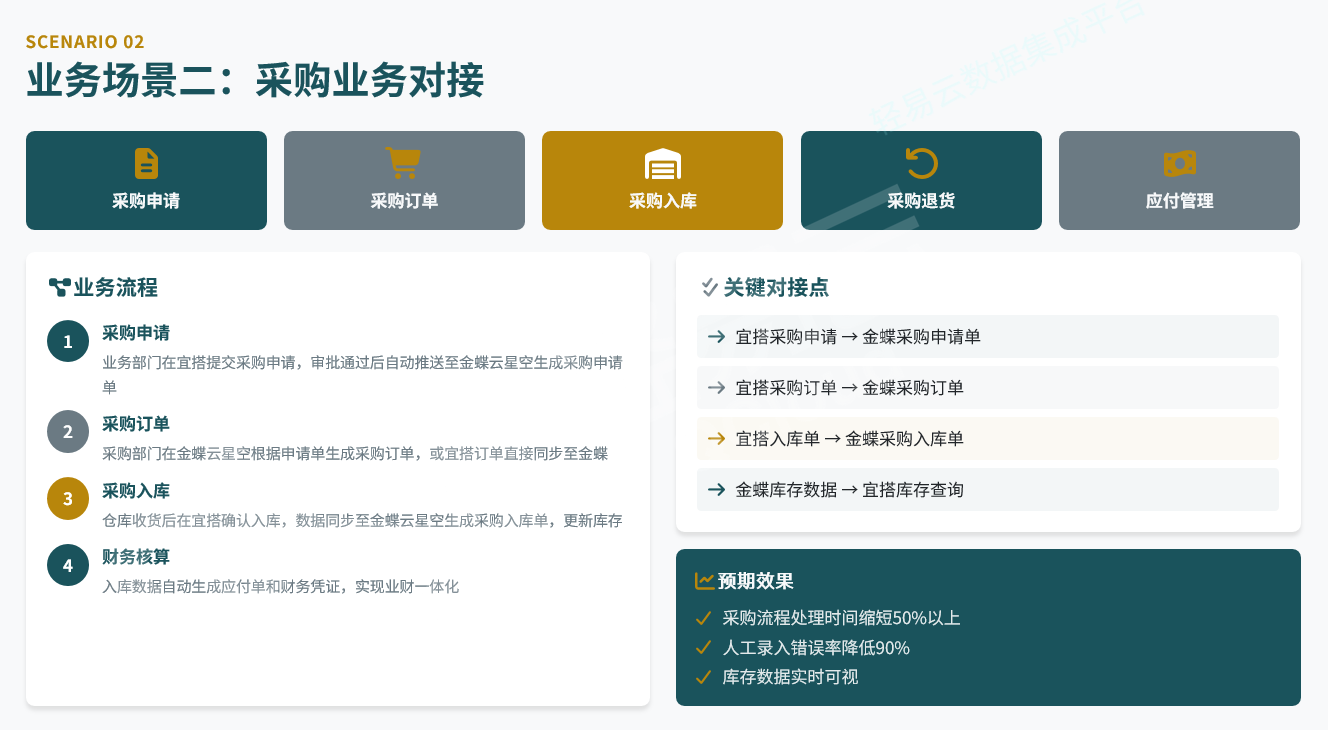 | 采购入库 | 到货确认(移动端) | 入库单生成 | 宜搭→金蝶 |