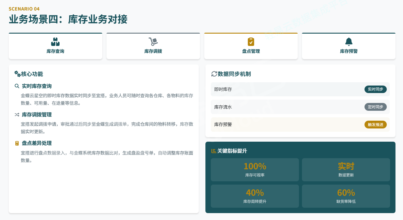 | 基础资料接口 | 客户、供应商、物料、仓库档案的增删改查 |