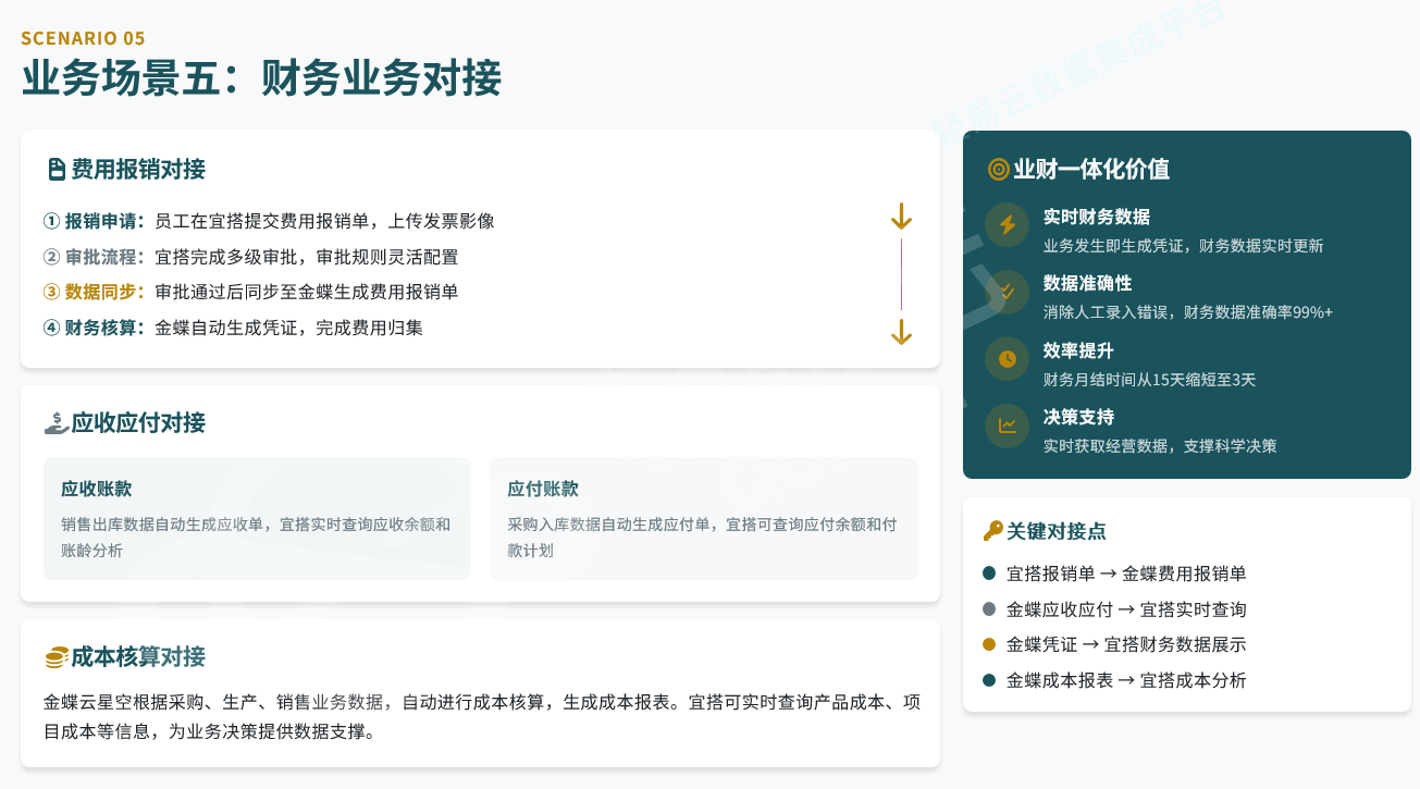宜搭完成审批流后,将报销单数据推送到金蝶费用报销模块或总账凭证接口。