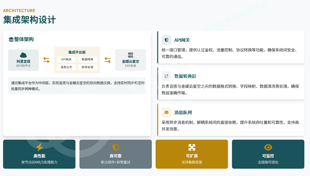 推荐采用集成平台(Integration Platform)作为中间层,而非直接点对点连接。系统架构分为三层: